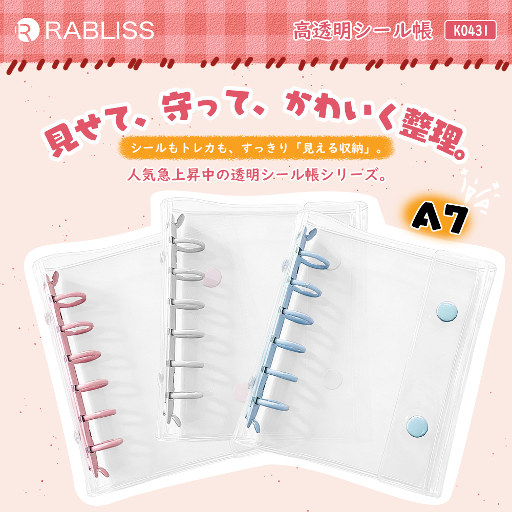 | 仕様 | <シール帳本体> 製品名:RABLISS 高透明シール帳 型 番:KO431 JAN:ホワイト 4573284123735 ピンク 4573284123742 ブルー 4573284123759 箱入数:40個 納 期:2月上旬頃 初回入荷予定 |