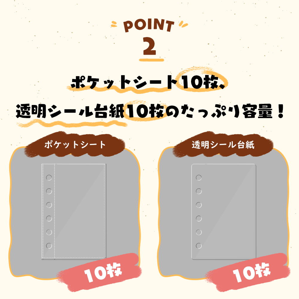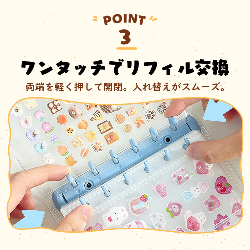 | 特徴 | ●手のひらサイズで持ち運びやすい。 ●高透明×2種類シール台紙 ●透明デザイン×パステルカラーで映える・見せるを両立した収納外観 ●ワンタッチでリフィル交換が簡単 ●2つのスナップボタンで持ち歩き時もしっかり閉じる安心設計 ●チャーム用ホール付きで自分仕様にアレンジ |
