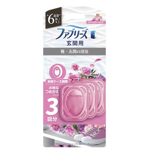 ファブリーズ玄関用消臭剤 スイートピオニー&ミュゲの香り。華やかでやさしいフローラルが玄関に広がり、しっかり消臭して好印象をキープ。本体とつめかえ用3個パックから選べる人気シリーズ。