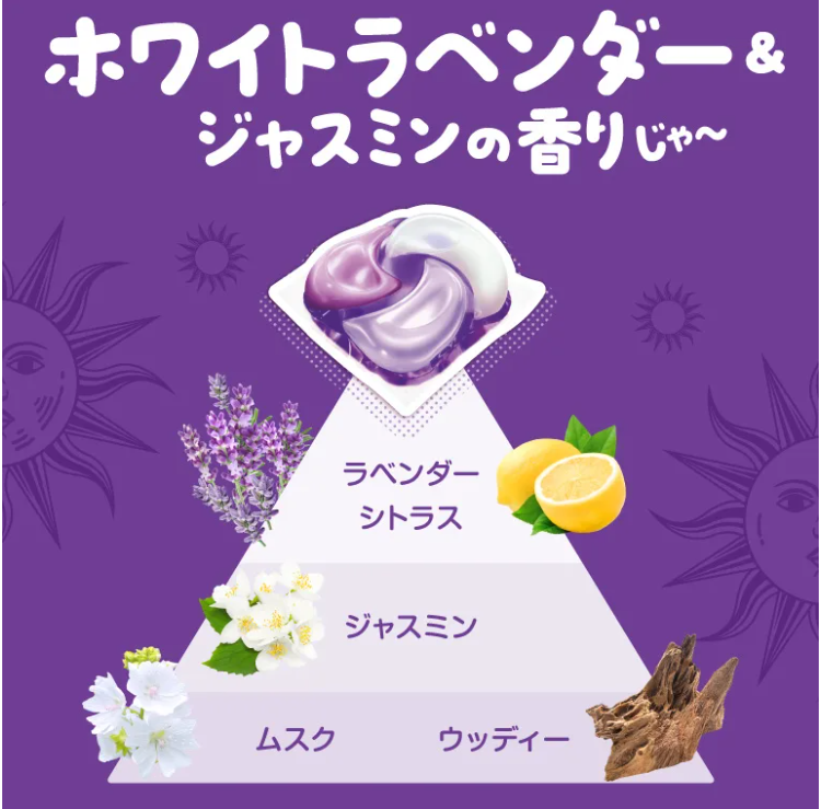 | 特徴 | 夜干しでも天日干し級の爽やかさ2日間ずーっと続く*1 1粒で究極パーフェクト* ファブリーズ レノアと共同開発 Yoruのホワイトラベンダー&ジャスミンの香り:心安らぐホワイトラベンダーとジャスミンの香りに包まれ、リラックスナイトに贅沢なときめきを。 柔軟剤効果 4 in 1 強洗浄 洗い上がり輝く白さ シワ*2 &黄ばみ防止*2 アイロンがけが楽に!*2 ふんわり仕上げ 驚きの柔らかさ。 香り長続き 着ている間も華やか。 消臭成分2倍濃縮*3 * 1粒で究極パーフェクトとは、消臭、香り、柔軟効果、シワ&黄ばみ防止という様々な機能が一粒で得られること。 *1 保管状態で。 *2 弊社他洗剤比、平均洗濯物量(P&G調べ)比。 *3 当社液体洗剤比。 ボールド 洗濯洗剤 太陽のジェルボール 4 in 1 5つ星HOTEL発想 Yoruのホワイトラベンダー&ジャスミンの香り |