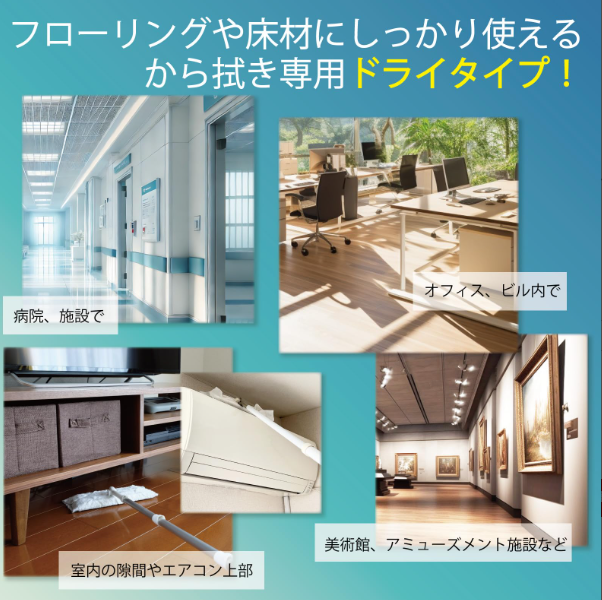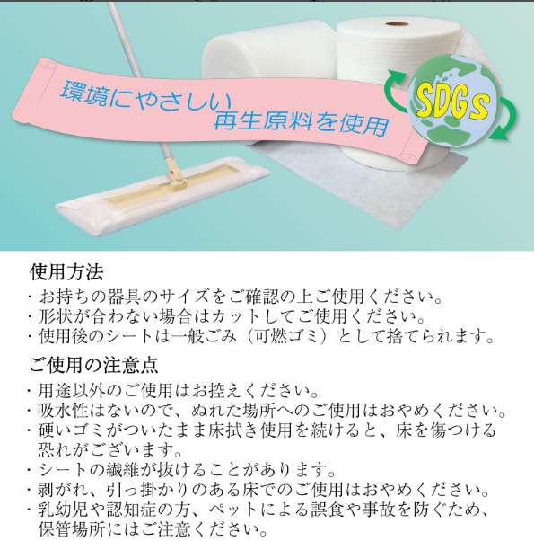 | 特徴 | 厚手の凹凸シートで汚れをふき取り! しっかり使えてお得なドライタイプのフローリングシートです。 |