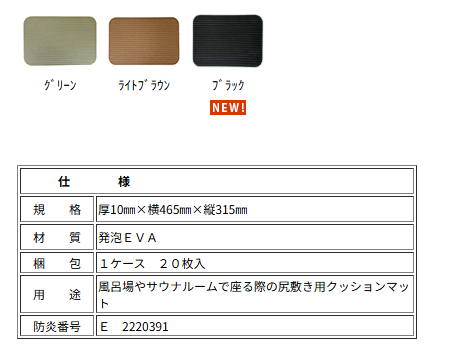 | 注意事項 | この製品をサウナルーム等、高温下で使用する際は、使用者が出入りの都度持ち運びください 常時設置しておくと温度の影響を受けて、製品が変形する恐れがあります |